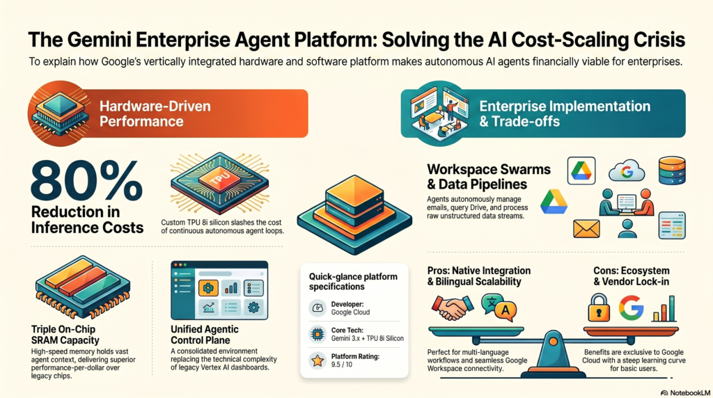 However, the real magic isn’t just software—it’s the hardware beneath it. Google recognized that autonomous agents are far too expensive to run on standard chips. To solve this, the platform runs exclusively on Google’s new TPU 8i (Inference) chips. Featuring triple the on-chip SRAM capacity of the previous generation, the TPU 8i holds vast amounts of “agent context” in high-speed memory, delivering an astonishing 80% improvement in performance-per-dollar.
