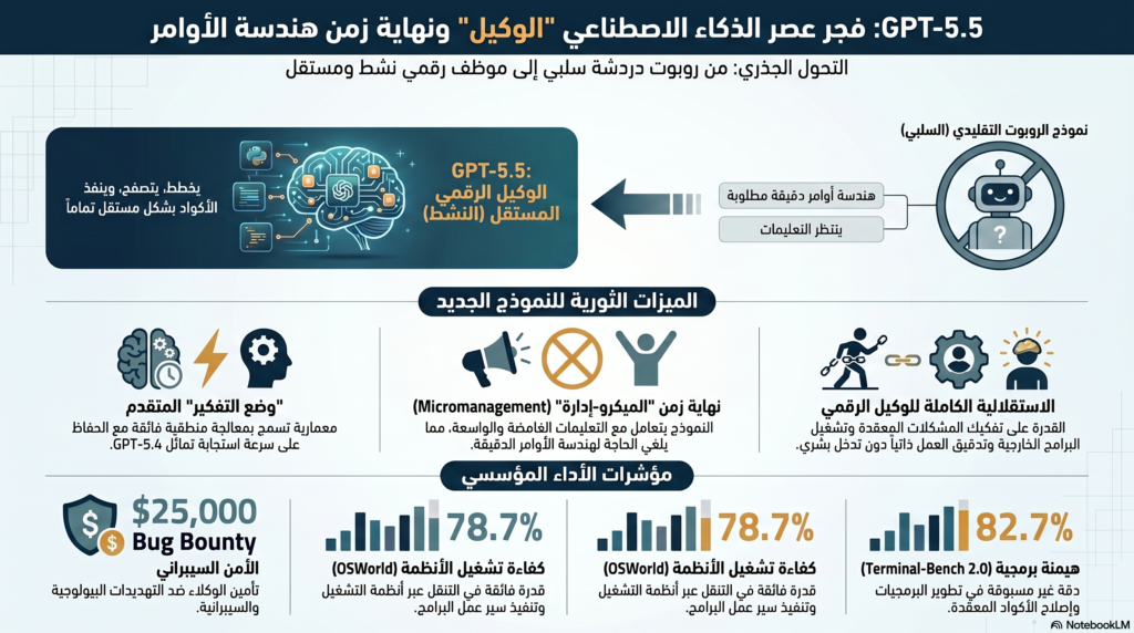 عصر “الأوامر” انتهى رسميًا. كشفت أوبن إيه آي عن GPT-5.5، تحديث يغير النموذج التقليدي ليحول ChatGPT من مساعد محادثة سلبي إلى عامل رقمي مستقل قادر على تنفيذ تدفقات عمل مؤسسية معقدة ومتعددة الخطوات.